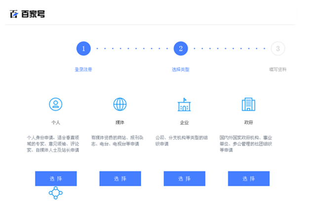 三,點注冊,會到達如下頁面,因為我們基本都是個人自媒體,所以就選擇個人,如果是企業、政府的話,就選擇企業、政府。